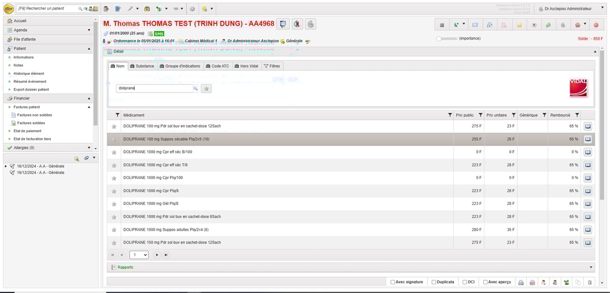 Asclépios s’appuie sur la base de données VIDAL pour offrir un module de prescription médical sécurisé et précis :